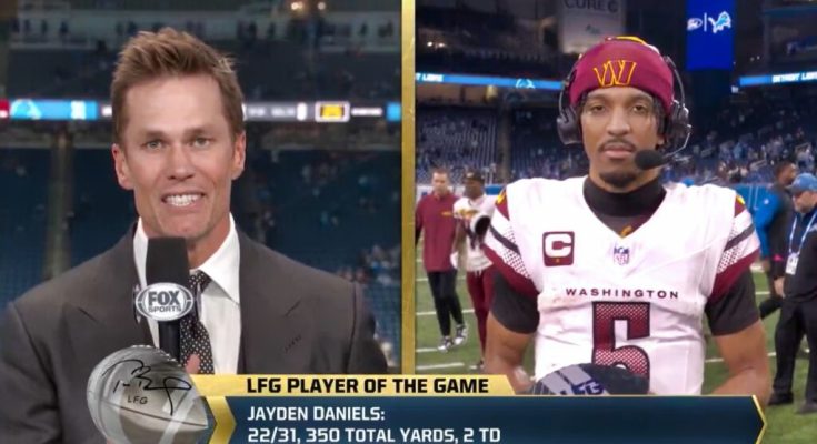 Tom Brady and Jayden Daniels had a hilarious post-game conversation on live television following the Washington Commanders’ stunning 45-31 road win over the top-seeded Detroit Lions in the Divisional Round.