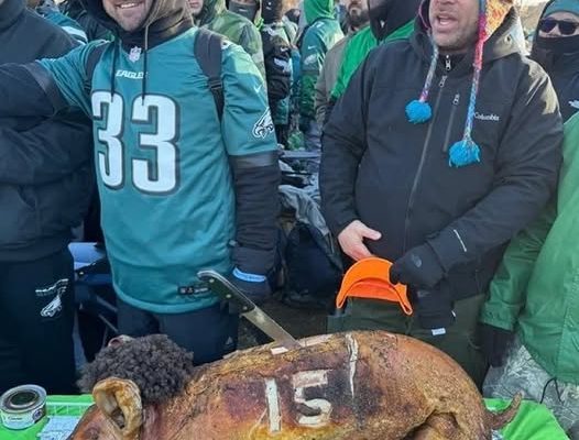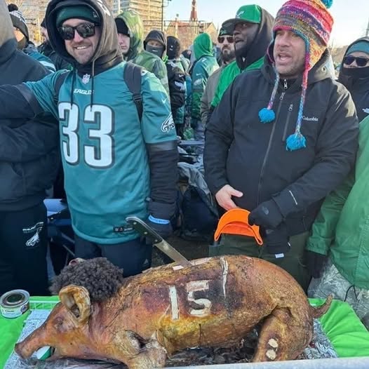 If you know Philly fans, this shouldn’t come off as surprisig at all. However, some of them were thought to have taken things way too far as they were spotted roasting a pig with a curly wig and the number 15 carved into its side.
