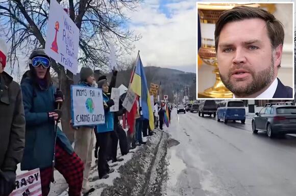 Protestors displayed signs that labeled Vance a “national disgrace,” accused him of being a “traitor” and encouraged the family to “go ski in Russia.”