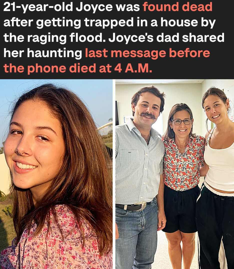 Before Joyce was found, her mother had shared the terrifying details of what unfolded early Saturday morning. She said Joyce had traveled to Hunt to celebrate the holiday with friends and was staying in a house on a hill near the river. Around 4 a.m., a sudden flash flood swept through the area, washing away their vehicles and trapping them before they could reach the attic.