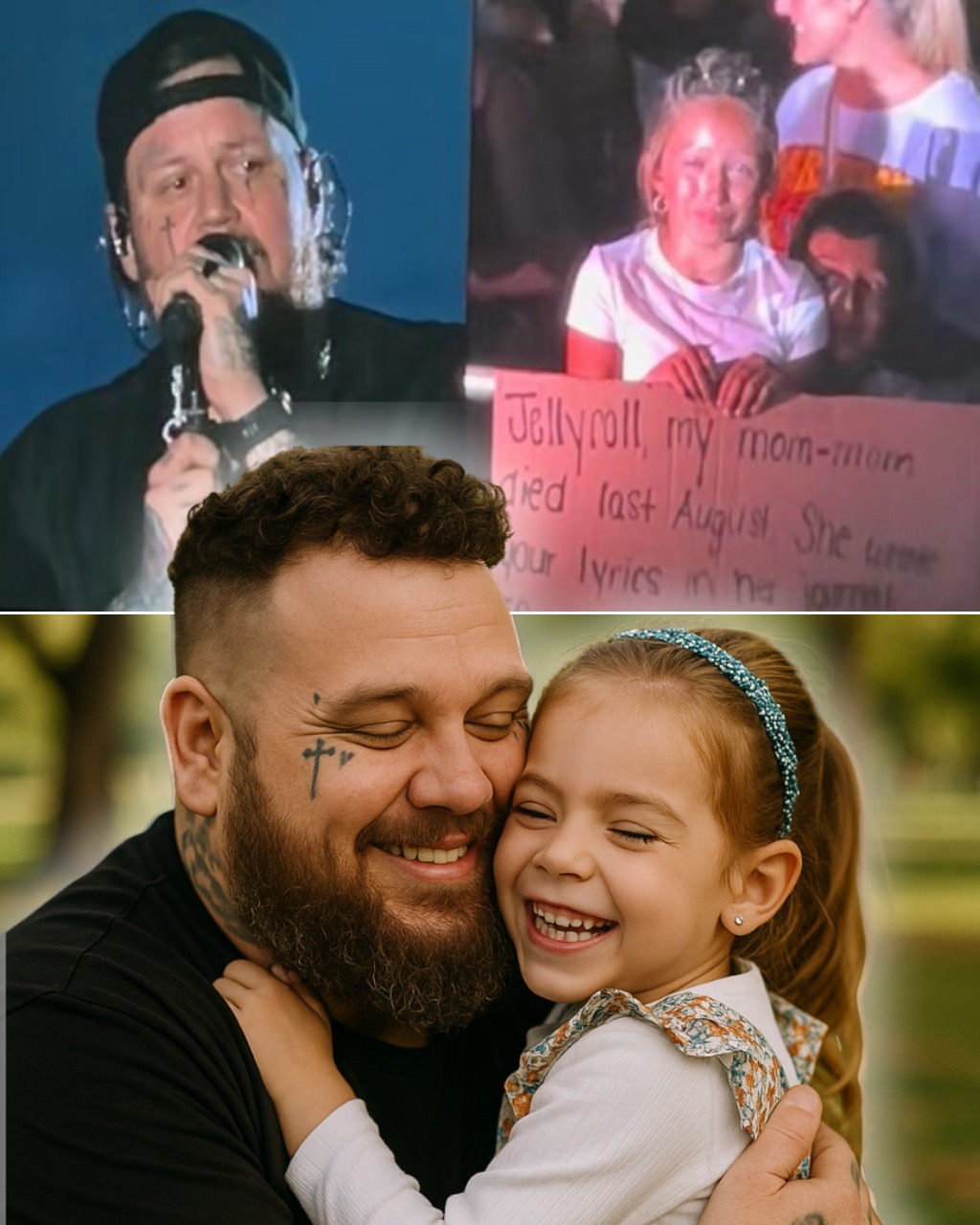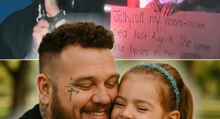 He was mid-song when he saw it — a small sign held high by tiny hands in the front row. “My mom passed away… but your music helps me smile again.” Jelly Roll’s voice caught. The lights blurred. And for a long moment, the concert stood still. Fighting back tears, he stepped off the stage, knelt beside the little girl, and held her like she was family. In a night filled with bass and beats, it was this silent moment — raw, human, unforgettable — that left every soul in the room forever changed.