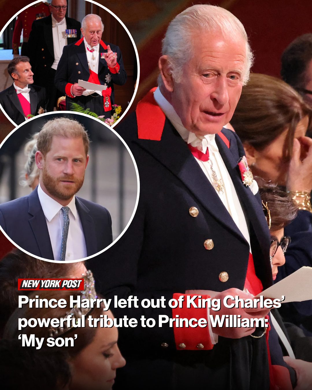 King Charles delivered a powerful tribute to his son Prince William during a lavish state banquet at Windsor Castle on Tuesday — but the monarch’s rare speech made no mention of his estranged son, Prince Harry.