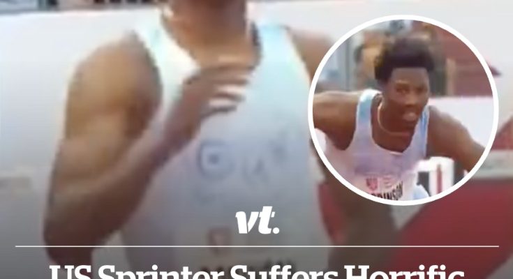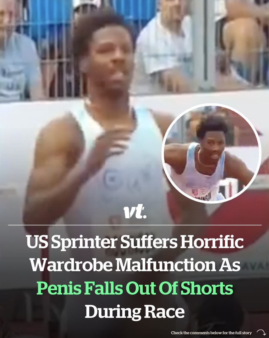 An American sprinter suffered a shocking wardrobe malfunction as his “manhood” fell out of his shorts during a race.