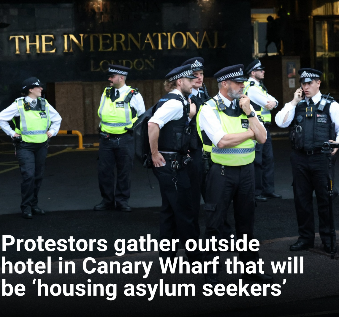 It is the second night of unrest in Canary Wharf after it emerged that the government intends to use the hotel as temporary accommodation for asylum seekers.