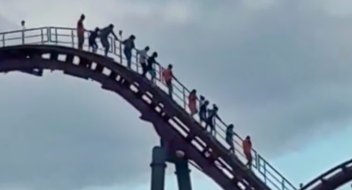 After exiting the cars, those who had been on the coaster are seen slowly walking down the evacuation steps while holding onto the metal railing.