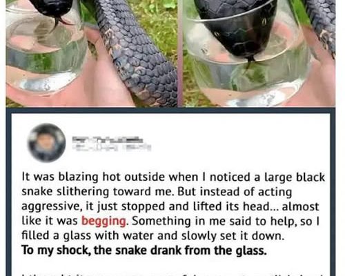 Jake’s peaceful day at the lake took a strange turn when a black snake slithered up to him. At first, he thought it was just curious—but its calm, almost pleading behavior was unlike anything he’d seen before. Instead of retreating, the snake stayed close. Moved by instinct, Jake offered it a glass of water. To his shock, it drank.