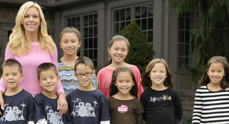 Collin, Joel, Alexis, Leah, Aaden, and Hannah Gosselin with Kate Gosselin and nurse Nurse Angie Crawl in Wyomissing on April 20, 2005 | Source: Getty Images