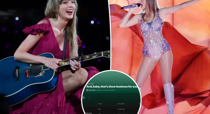 The signs directed fans to Swift’s Spotify playlist, “And, baby, that’s show business for you.”