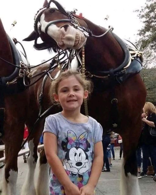 A father and his young daughter were out for a drive when they spotted a group of majestic Clydesdale horses behind a fence. Drawn by curiosity, the little girl asked to get closer. At first shy, she soon gathered her courage and stood near one of the gentle giants as her father pulled out his phone for a picture. She smiled sweetly for the camera—only to discover later that the horse behind her had smiled too. Not just any smile, but a wide, toothy grin, perfectly timed for the shot. The father posted the photo online, and it quickly went viral, earning features in Time Magazine and BuzzFeed. For the family, though, it wasn’t about the attention—it was about a magical, unplanned moment of pure joy. Sometimes, the best memories happen when you least expect them… and in this case, when a horse decides to join in with a smile.