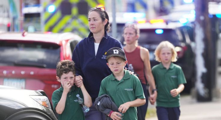 Parents lead their children out of Annunciation Catholic School in Minneapolis after the church shooting on August 27, 2025 | Source: Getty Images