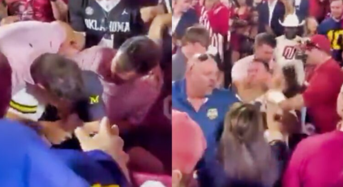 Michigan Fan Gets Put In Back-To-Back Chokeholds By Oklahoma Fans During Crazy Stadium Brawl [VIDEO]