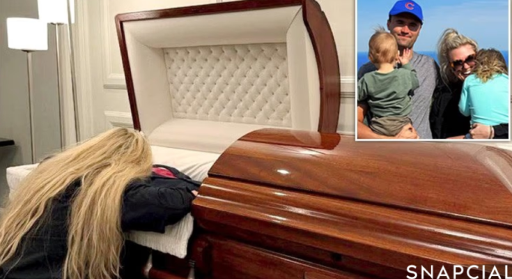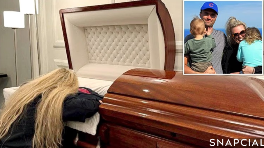 In another image she can be seen with her back to the camera, her long blonde hair cascading over her shoulders, as she appears to be collapsed in grief as she lies draped across her husband’s casket.