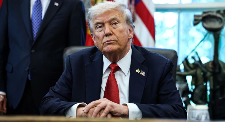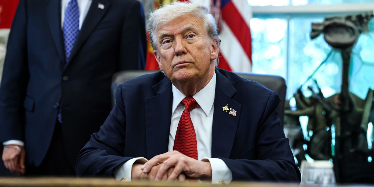 President Donald Trump speaks during an event on October 16, 2025, in the White House. The Oval Office is framed by gold-trimmed drapes, military banners, and the iconic Resolute Desk beneath a portrait-lined wall.