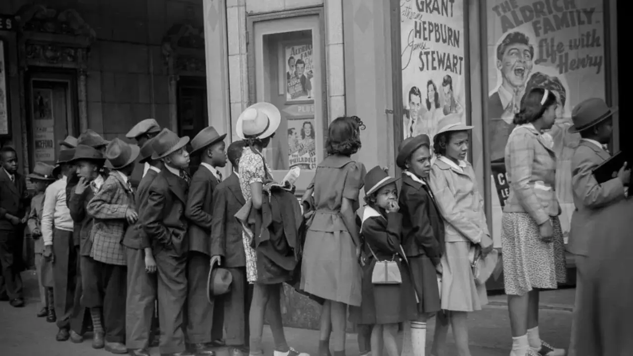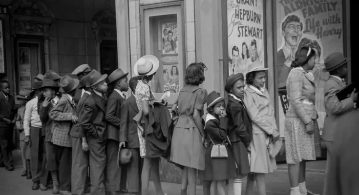 The photo captures a group of children waiting in line outside a movie theater in Chicago, providing a fascinating window into a bygone era.